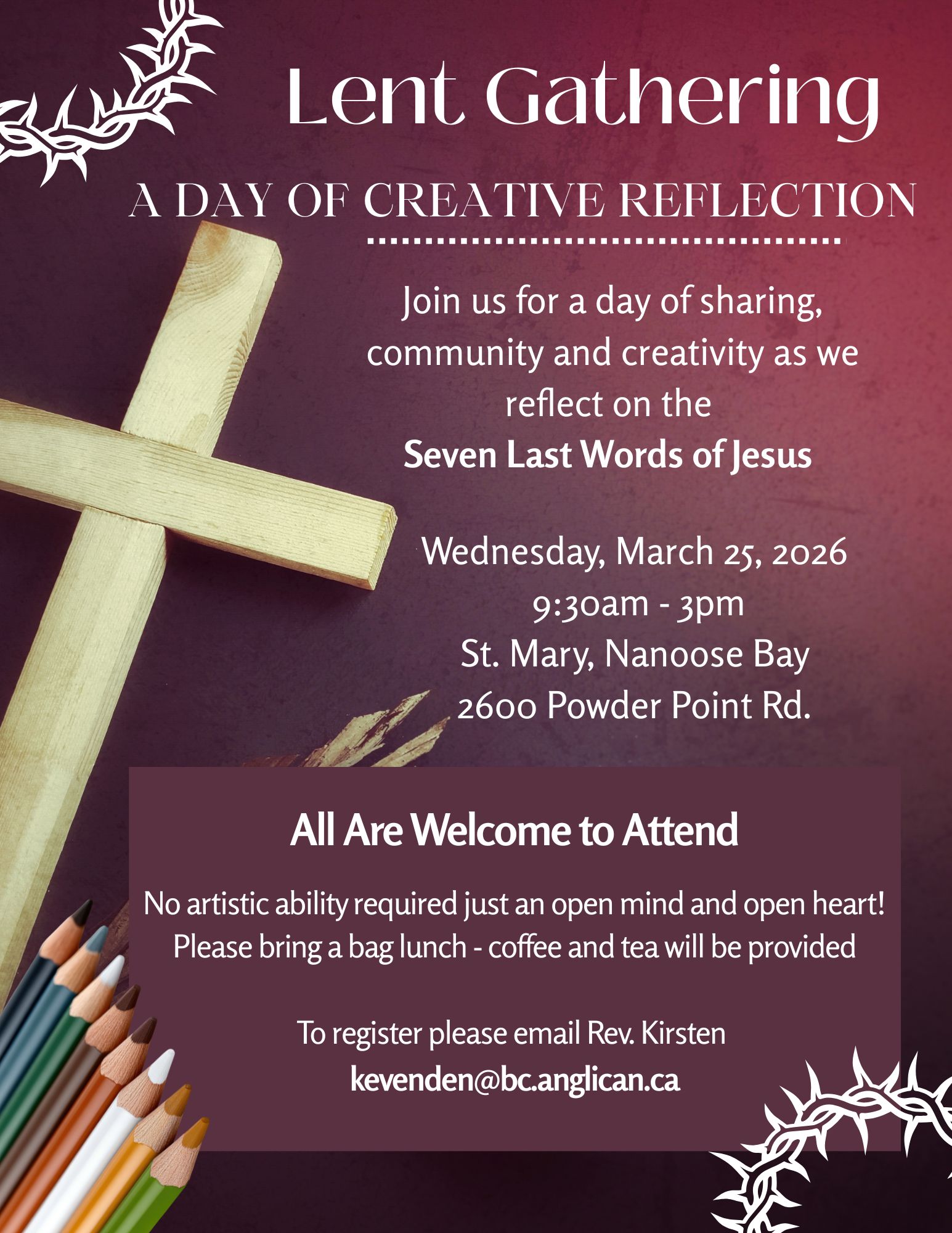 St Mary's Nanoose Bay welcomes everyone to join them for a day of sharing, reflection, and creativity as we move together through the Last Seven Words of Jesus.