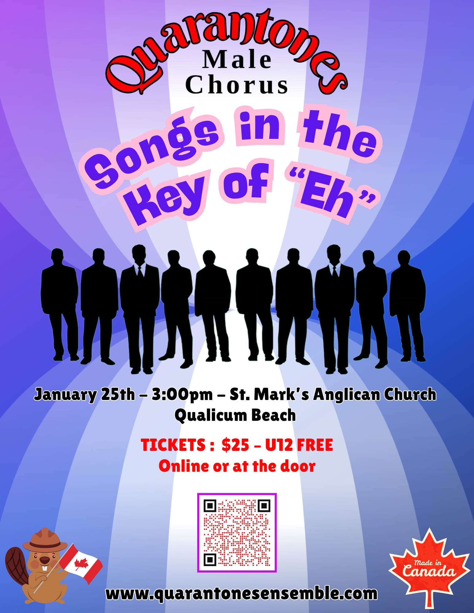 The "Quarantones Male Chorus” is a small, auditioned, male voice choir from the Comox Valley. They will perform in concert at St. Mark’s on Sunday afternoon, January 25 at 3:00 PM, and will feature Canadian music, musicians, and composers.